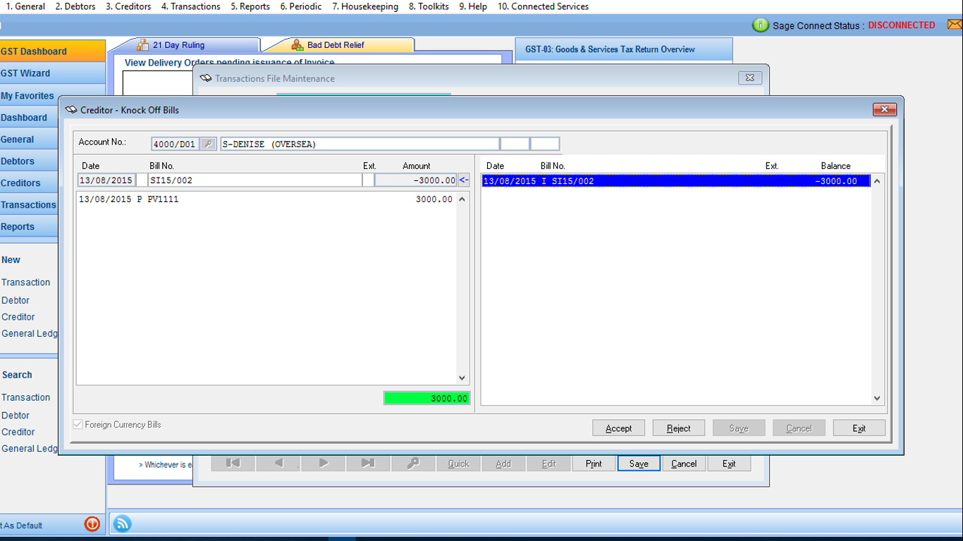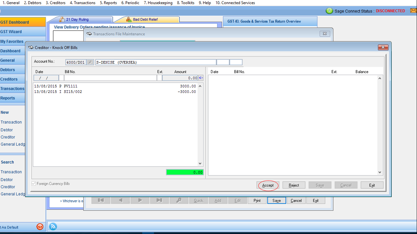 3) Once clicked on save, Creditor - Knock Off Bills will be popping out as the screenshot below. Once this window popped out, press on enter button to drill down the payment list and invoices owing list to the particular supplier.