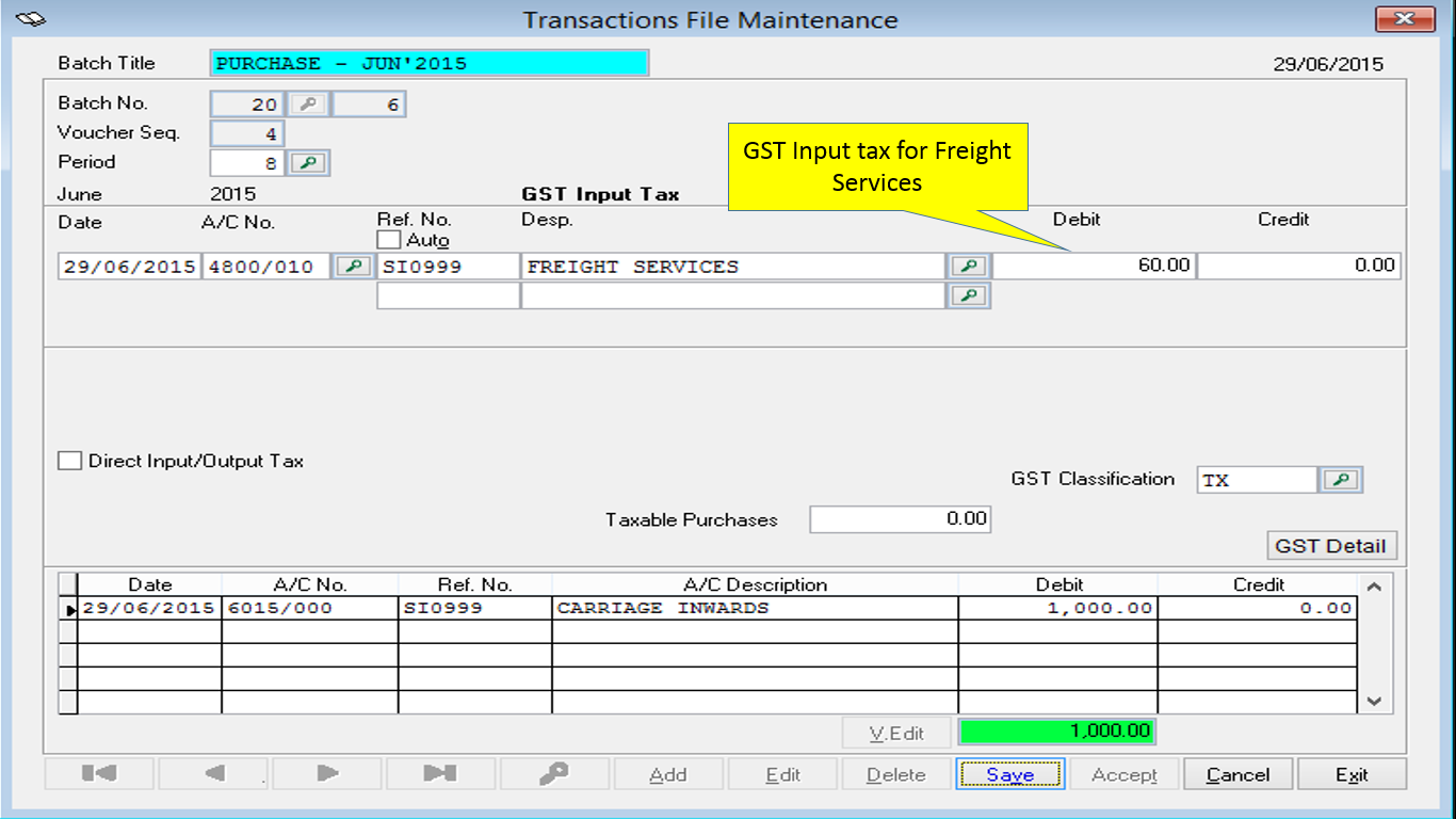 STEP 1 : (a) Debit Carriage Inwards for Freight Service Charges and Link to TX tax code as it is Standard Taxable Purchase