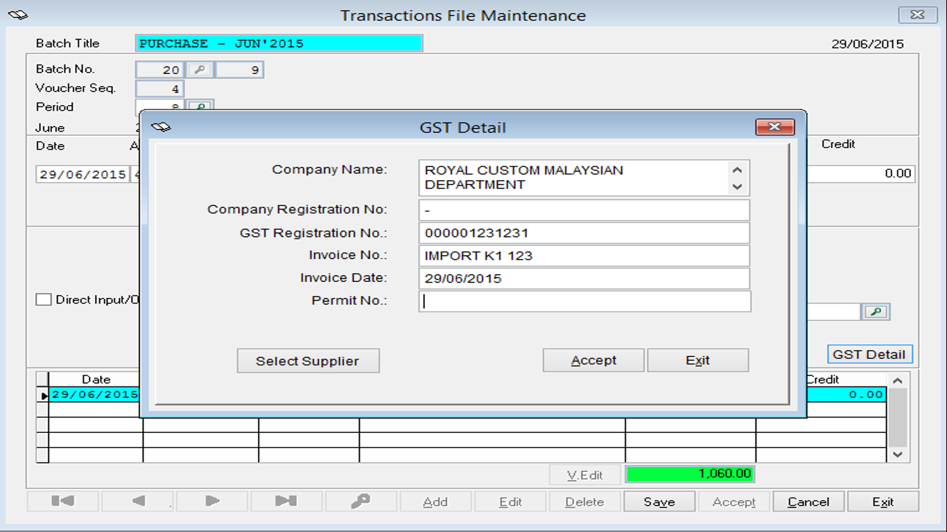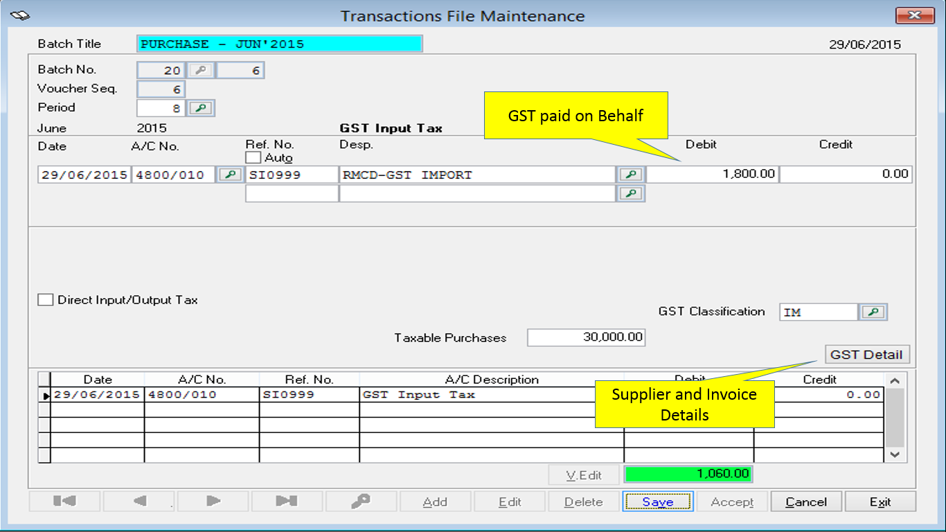 STEP 3: (a) Debit the GST Input Tax for Importation of Goods (based on K1 form) which is the GST amount paid on behalf.