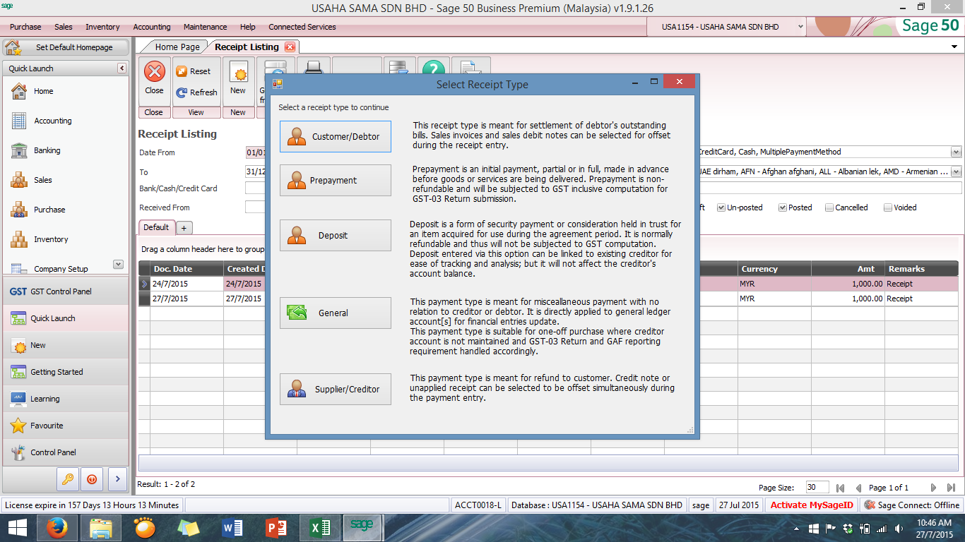 2. Select the Customer, Bank and key in the receipt amount. Then click Generate Double Entry