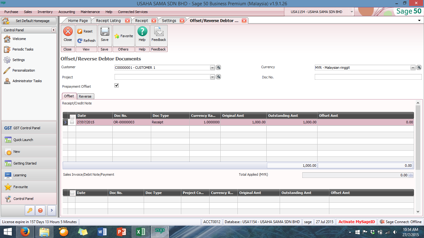1. Go to Accounting > Offset/Reverse Documents > Debtor Documents. Select Customer and tick Prepayment Offset. Select the relevant prepayment with tax invoice.