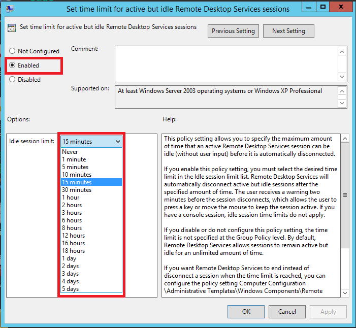 7. Enable the Setting and set the time limit that you want. For example 15 minutes. Then Click "OK" button.