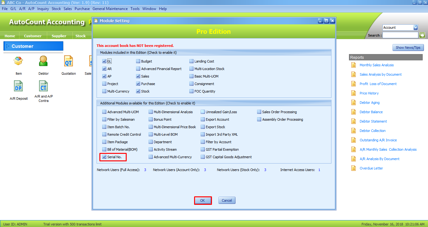 Step 1: Make sure the Serial No. box is checked from Tools --> Program Control --> Module Setting.