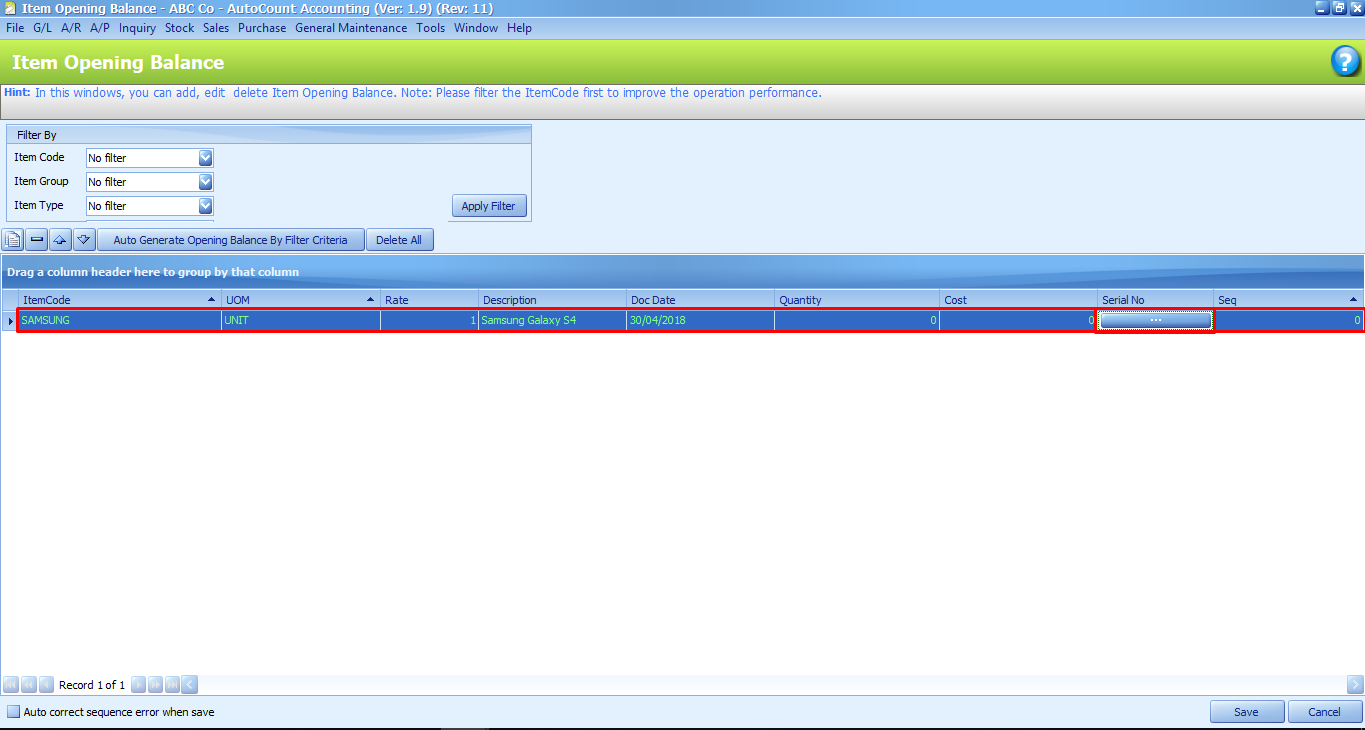 Step 3: From Stock --> More Stock Maintenance --> Item Opening Balance Maintenance select the target item with serial no. Hence click on icon below Serial No. as highlighted in small boxes.