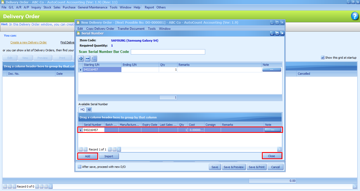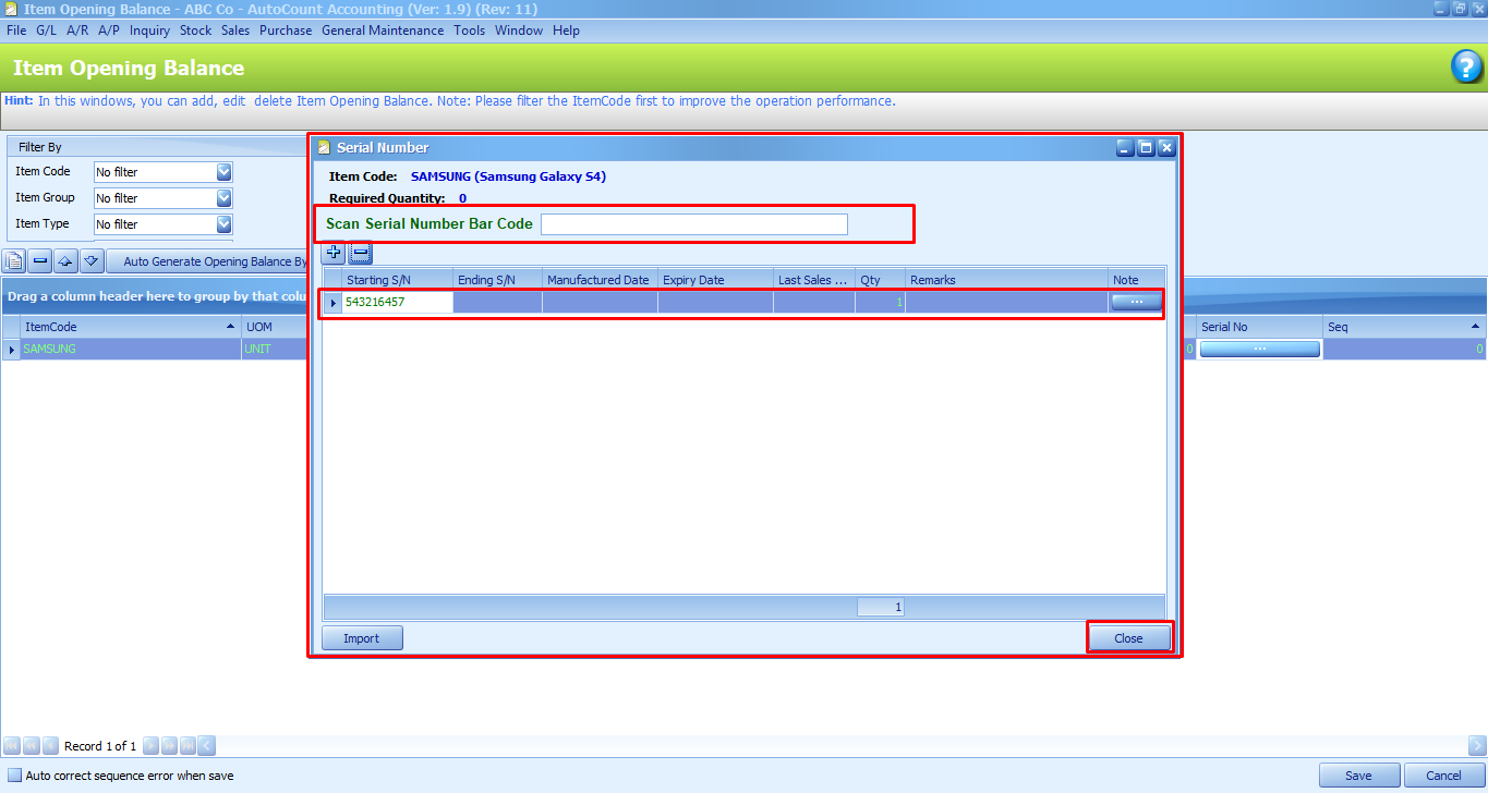 Step 4: Key in the serial number for that item and click on add icon to add serial number list for target item. Click on Close when you have done adding serial number listing.