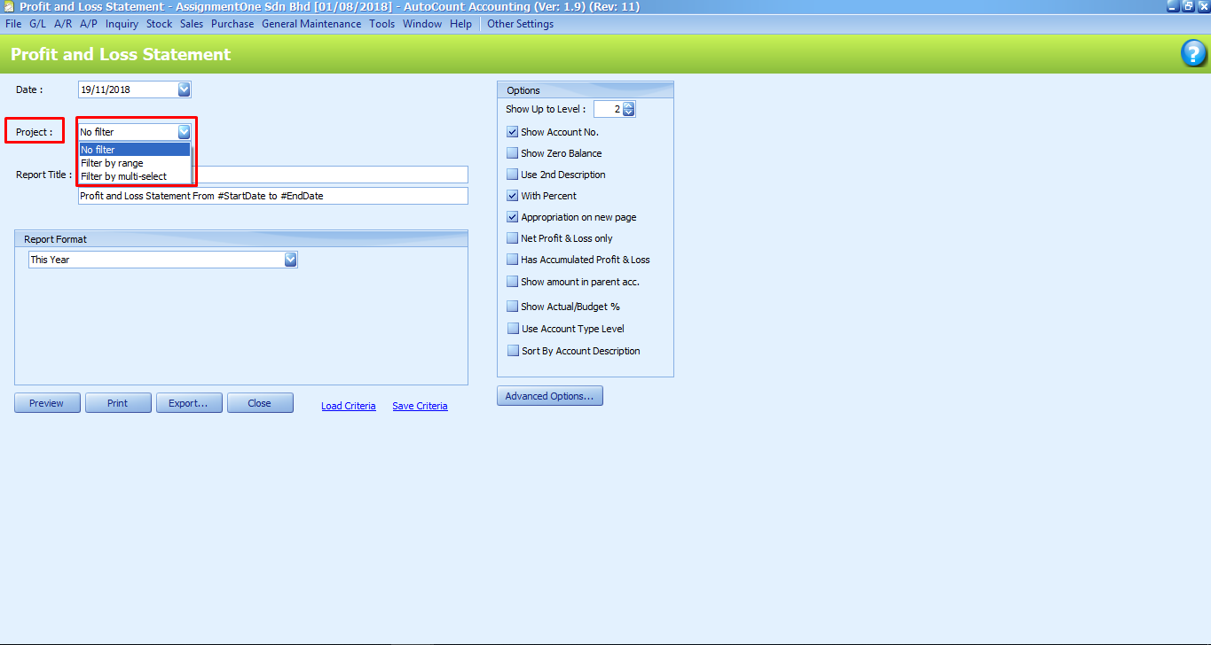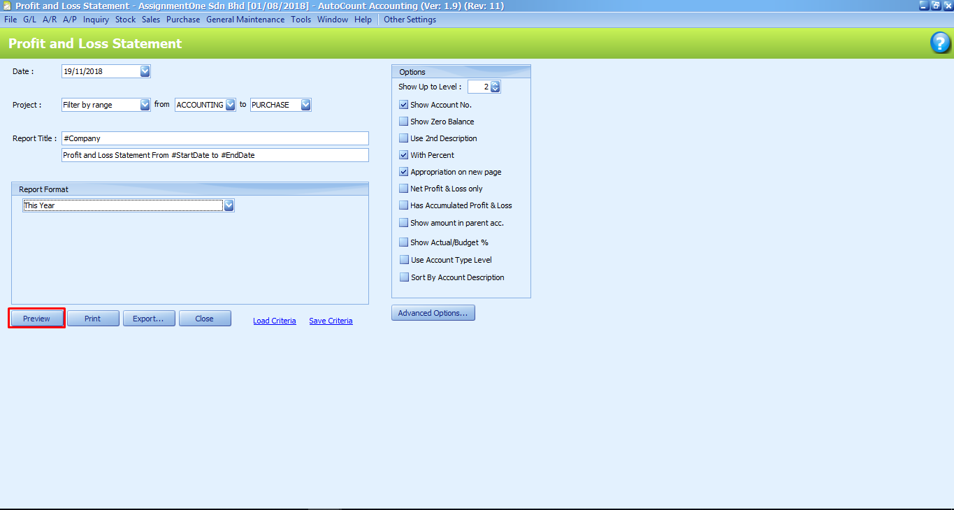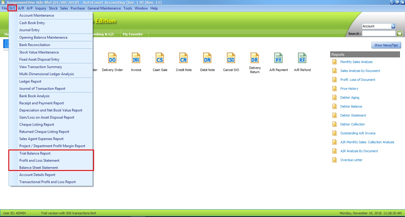 Step 1: HIghlight G/L --> Then select any accounting report to be reviewed (Trial Balance, P&L Report etc)