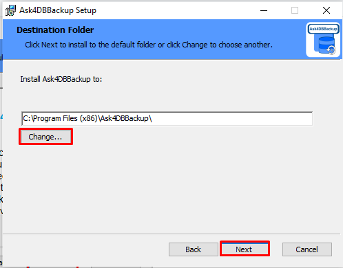 The default pathway to store Ask4DBBackup program file is C: --> Program Files (X86) --> Ask4DBBackup. User(s) may change the pathway to store its file by selecting 'Change' (Make sure your current drive is sufficient to carry its file)/