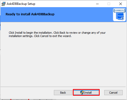 You are ready to install the Ask4DBBackup program. Click on 'Install' to begin installation process, or click on Back to re-check the detail.